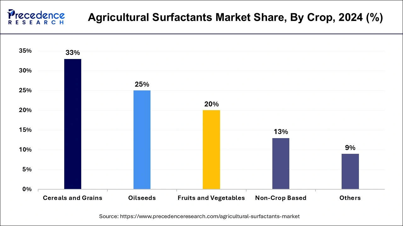 The grains and cereals segment dominated the agricultural surfactants market in 2024due to their economic significance and rapid spread of cultivation. These grains and cereals cover the largest portion of agriculture manufacturing. Agricultural surfactants play a crucial role in enhancing pesticide quality by improving absorption, spreading, and adhesion on grain and cereal surfaces. The demand for higher crop efficiency to feed the rising population highlighted the importance of accurate agrochemical application.