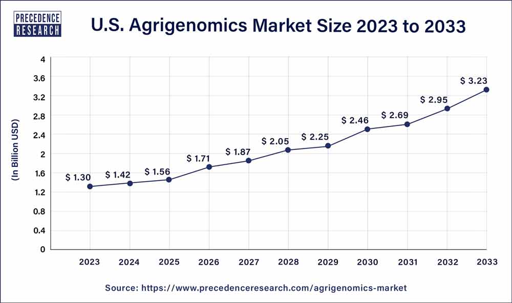 The U.S. agrigenomics market size was valued at USD 1.30 billion in 2023 and is anticipated to reach around USD 3.23 billion by 2033, poised to grow at a CAGR of 9.55% from 2024 to 2033.
