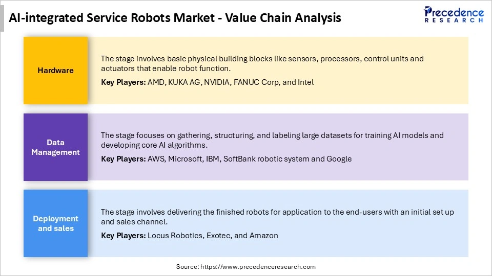 The AI-integrated service robots market involves the development, sale, and deployment of robots that use artificial intelligence to interact with humans and perform tasks that humans do, with high precision and continuously. It is performed unlike traditional, pre-programmed machines, these robots can recognize their environment and adjust accordingly. While learning from real-time data inputs is crucial for integrating AI into robotics, it also expands the market reach.
