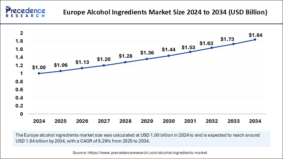 The Europe alcohol ingredients market size was exhibited at USD 1.00 billion in 2024 and is projected to be worth around USD 1.84 billion by 2034, growing at a CAGR of 6.29% from 2025 to 2034.