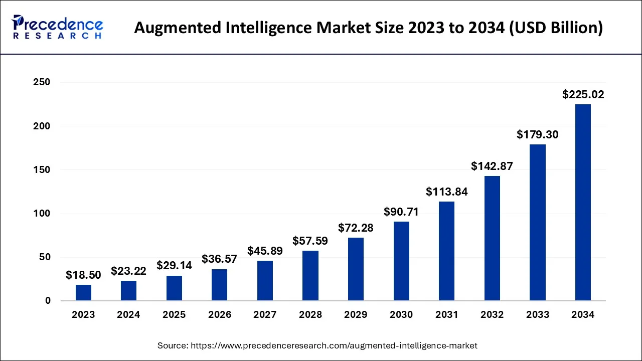 The global augmented intelligence market size is calculated at USD 23.22 billion in 2024 and is projected to surpass around USD 225.02 billion by 2034, growing at a CAGR of 25.5% from 2024 to 2034.