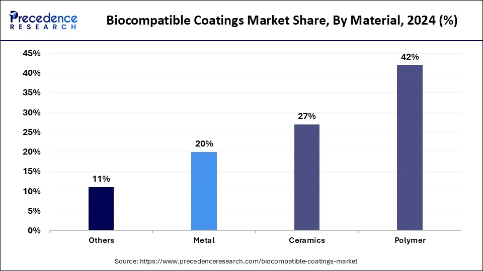 The polymers segment accounted for a considerable share of the biocompatible coatings market in 2024 due to their flexibility and numerous beneficial characteristics. There are vast numbers of polymers used in medical applications, including synthetic polymers and natural polymers. They are flexible, easy to process, and biocompatible. Both solvent and aqueous-based formulations of these coatings are employed or are under consideration in a broad spectrum of medical applications, including implants, stents, wound dressings, and drug delivery systems. The usage of polymers has increased due to the provision of polymers that can be customized based on application requirements, such as controlling the release rate of the drug or surface characteristics. Additionally, their utilization of medical technologies is due to their cheaper cost of production and the endless technological improvements in polymer science.
