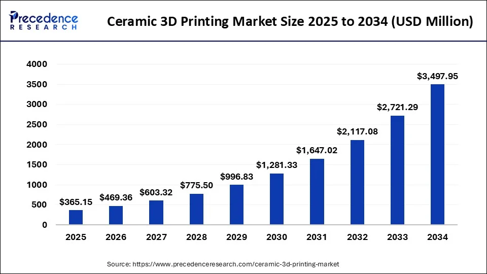 The global ceramic 3D printing market size is calculated at USD 365.15 million in 2025 and is predicted to reach around USD 3497.81 million by 2034, expanding at a notable CAGR of 28.54% from 2025 to 2034. Increasing applications of ceramics in industries like automotive, aerospace, and healthcare is the key factor driving the ceramic 3D printing market growth. Also, the introduction of new product launches along with the increasing awareness of the benefits of 3D printing is expected to fuel market growth shortly.