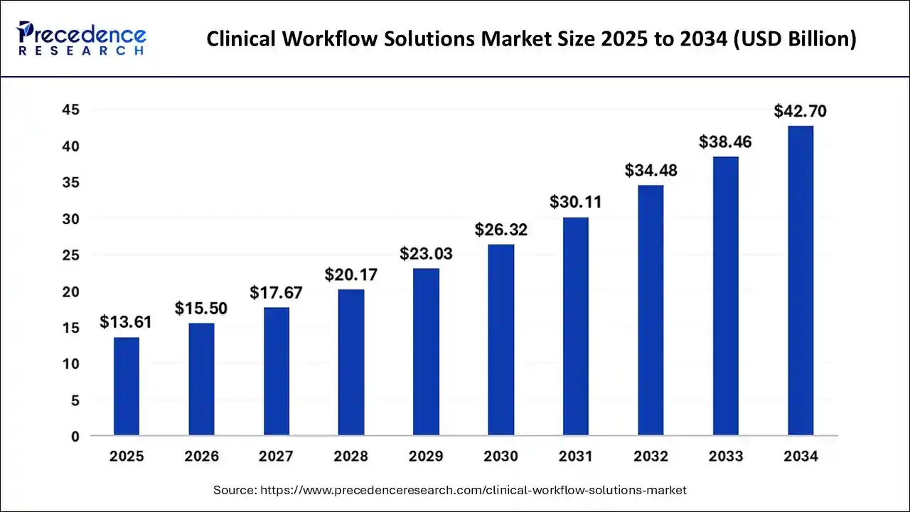 The global clinical workflow solutions market size is valued at USD 13.61 billion in 2025 and is predicted to increase from USD 15.50 billion in 2026 to approximately USD 42.7 billion by 2034, representing a healthy CAGR of 13.57% between 2025 and 2034. The market is experiencing significant growth due to the increasing focus of healthcare organizations on streamlining operations and reducing costs.