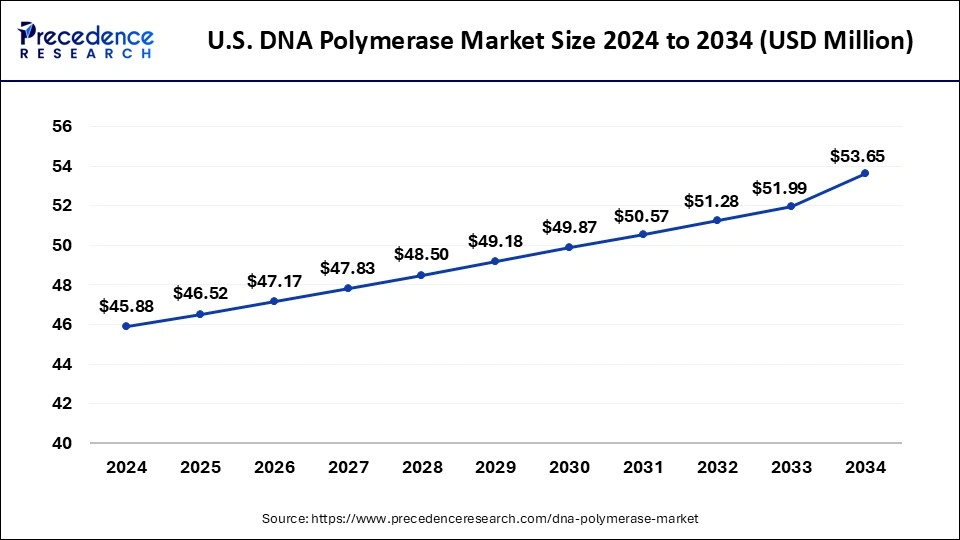 The U.S. DNA polymerase market size was exhibited at USD 45.88 million in 2024 and is projected to be worth around USD 53.65 million by 2034, growing at a CAGR of 1.58% from 2025 to 2034.