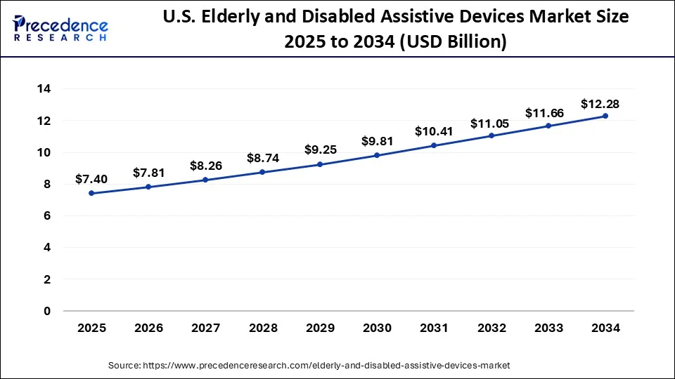 The U.S. elderly and disabled assistive devices market size is exhibited at USD 7.40 billion in 2024 and is projected to be worth around USD 12.28 billion by 2034, growing at a CAGR of 5.77% from 2025 to 2034.