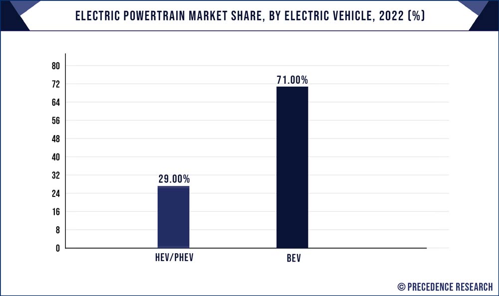 Based on electric vehicle, the global market for electric powertrain is classified into Battery Electric Vehicle (BEV) and Hybrid Electric Vehicle / Plug-in Hybrid Electric Vehicle (HEV/PHEV). The BEV segment dominated the market accounting for nearly 72% of value share in the year 2024. The rising adoption of BEV is majorly because of stringent government policies to regulate the carbon emission from transportation sector. Moreover, advancements in the battery technology along with declining price for lithium-ion battery anticipated to leverage the demand for BEV in the coming years.
