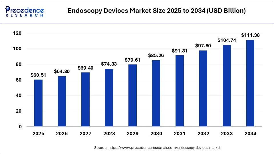 The global endoscopy devices market size is calculated at USD 60.51 billion in 2025 and is predicted to increase from USD 64.80 billion in 2026 to approximately USD 111.38 billion by 2034, growing at a CAGR of 7.10% from 2025 to 2034.