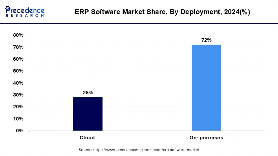 On-premises is anticipated to hold the largest market share of 72% in 2024. On-premises deployment in the enterprise resource planning (ERP) software market refers to the traditional model where ERP software is installed and hosted on the company's own servers and infrastructure. While this approach offers greater control over data and customization, it often entails higher upfront costs and maintenance responsibilities. Recent trends show a gradual shift towards cloud-based ERP solutions due to their scalability, cost-effectiveness, and accessibility from anywhere. However, some industries with stringent data security and compliance requirements still prefer on-premises deployments, highlighting a continued niche demand for this deployment method.