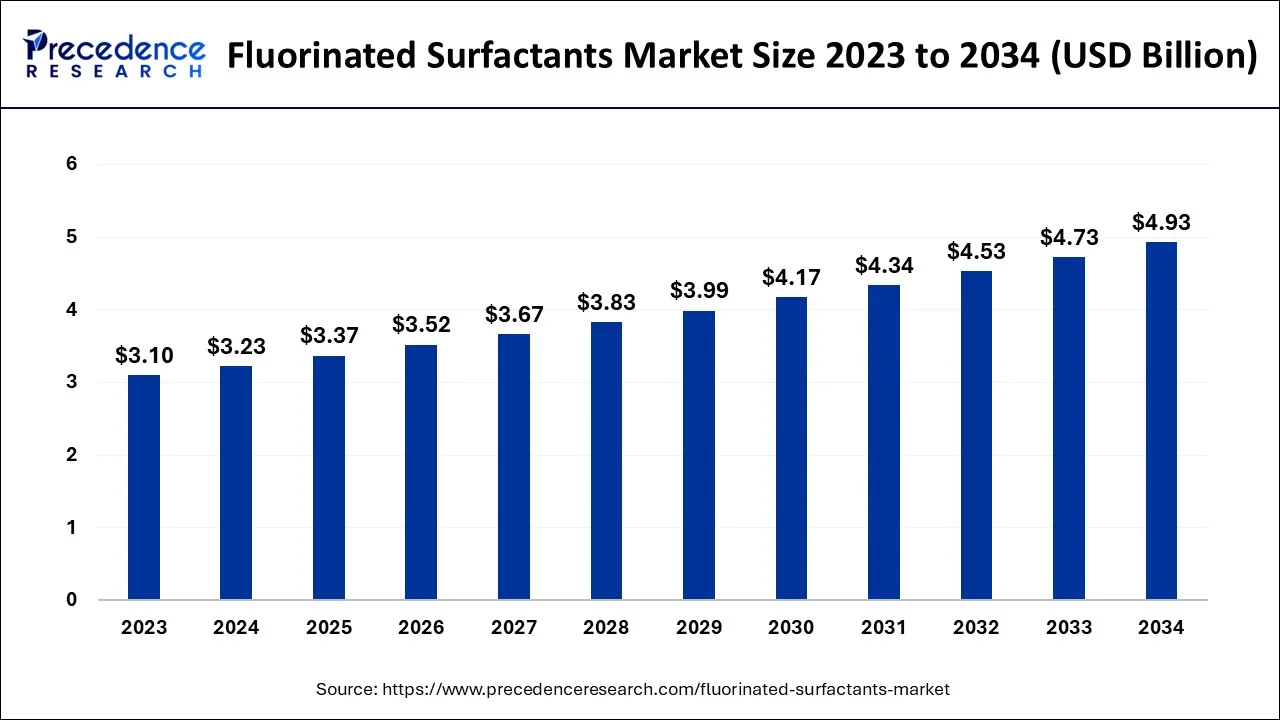 The global fluorinated surfactants market size is estimated at USD 3.23 billion in 2024 and is anticipated to reach around USD 4.93 billion by 2034, expanding at a CAGR of 4.31% from 2024 toi 2034.