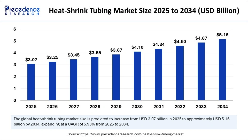 The global heat-shrink tubing market size accounted for USD 3.07 billion in 2025 and is predicted to increase from USD 3.25 billion in 2026 to approximately USD 5.16 billion by 2034, expanding at a CAGR of 5.93% from 2025 to 2034. The heat shrink tubing market is expanding due to its exceptional capabilities to protect delicate wirings and offer sustainability. The growing sector like electronics, automotive, aerospace and Défense are increasingly adopting heat shrink tubing for highest protection against environmental fluctuations further escalating the market.