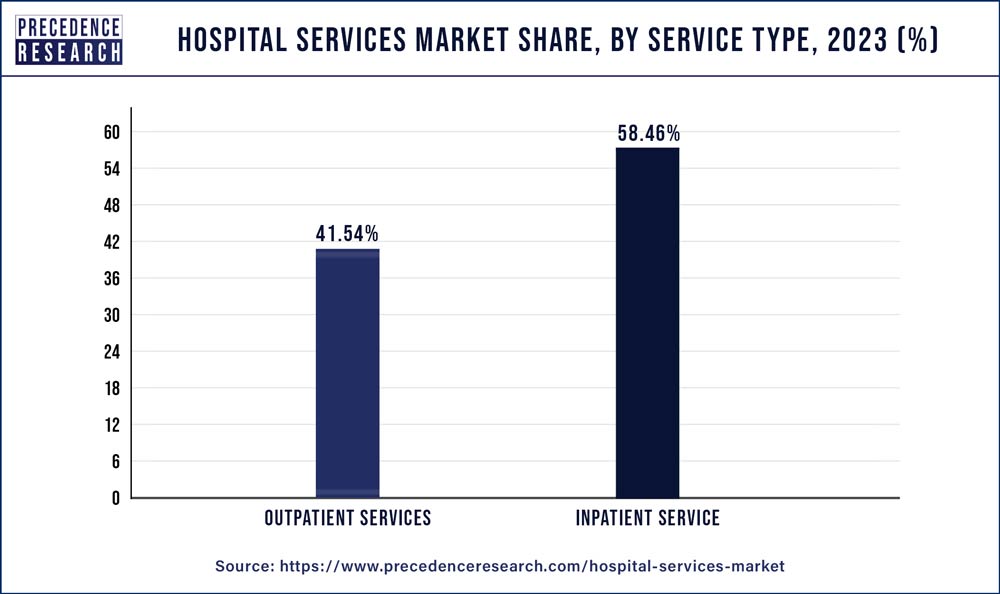 In 2024, inpatient services accounted for 58.09% of the global hospital service market share, whereas outpatient services accounted for the remaining share. This was mainly because of hospitalization procedures that require long hospital stays.