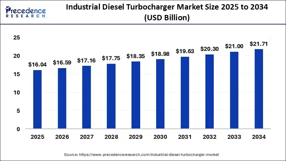 The global industrial diesel turbocharger market size is valued at USD 16.04 billion in 2025 and is predicted to increase from USD 16.59 billion in 2026 to approximately USD 21.71 billion by 2034, expanding at a CAGR of 3.42% from 2025 to 2034. The key factor driving market growth is the increasing focus on sustainable operations. Also, the increasing need for fuel efficiency coupled with the stringent emission regulations across many sectors can fuel market growth further.