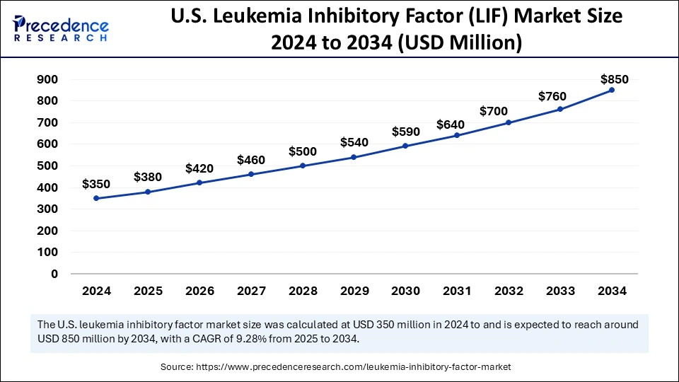 The U.S. leukemia inhibitory factor (lif) market size was exhibited at USD 350 million in 2024 and is projected to be worth around USD 850 million by 2034, growing at a CAGR of 9.28% from 2025 to 2034.