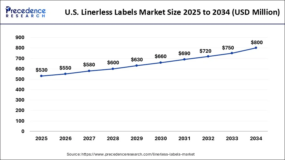 The U.S. linerless labels market size was exhibited at USD 530 million in 2025 and is projected to be worth around USD 800 million by 2034, poised to grow at a CAGR of 4.60% from 2025 to 2034.