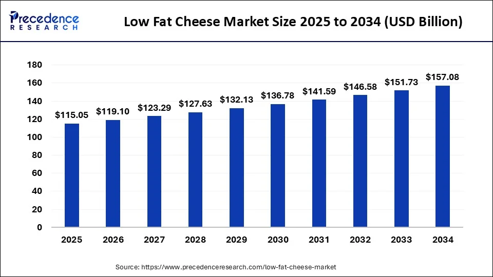 The global low fat cheese market size is calculated at USD 115.05 billion in 2025 and is predicted to reach around USD 157.08 billion by 2034, expanding at a CAGR of 3.52% from 2025 to 2034. The low fat cheese market growth is attributed to increasing consumer health consciousness and the expansion of innovative product offerings that cater to dietary preferences.