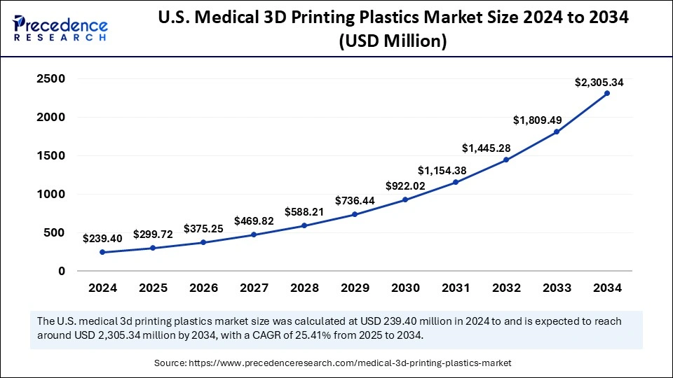 The U.S. medical 3D printing plastics market size is exhibited at USD 299.72 million in 2025 and is projected to be worth around USD 2,305.34 million by 2034, growing at a CAGR of 25.41% from 2025 to 2034.