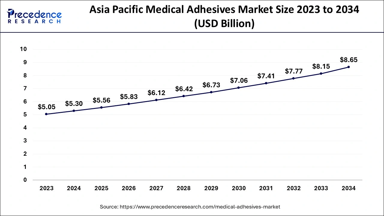 The Asia Pacific medical adhesives market size is evaluated at USD 5.30 billion in 2024 and is predicted to be worth around USD 8.65 billion by 2034, rising at a CAGR of 5.01% from 2024 to 2034.
