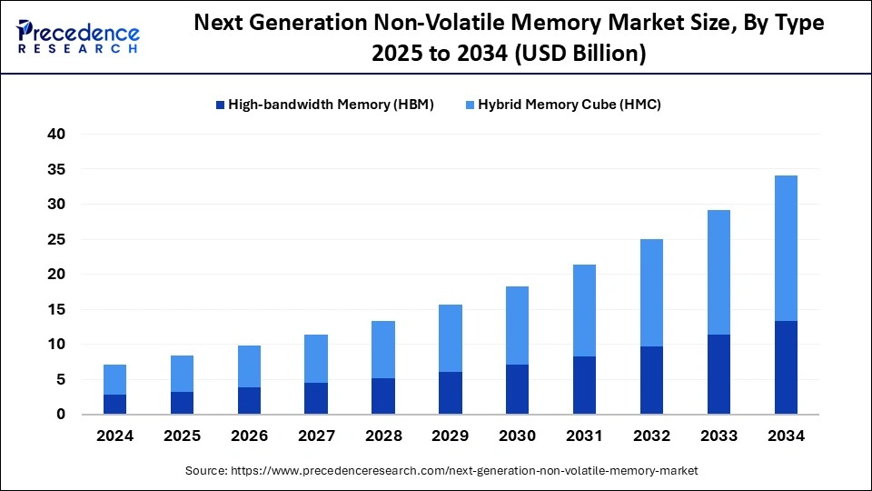 The global next generation non-volatile memory market size accounted for USD 7.14 billion in 2024 and is predicted to increase from USD 8.35 billion in 2025 to approximately USD 34.12 billion by 2034, expanding at a CAGR of 16.93% from 2025 to 2034.The growth of the market is driven by the rising need for high-speed data access and the increasing adoption of AI and IoT.