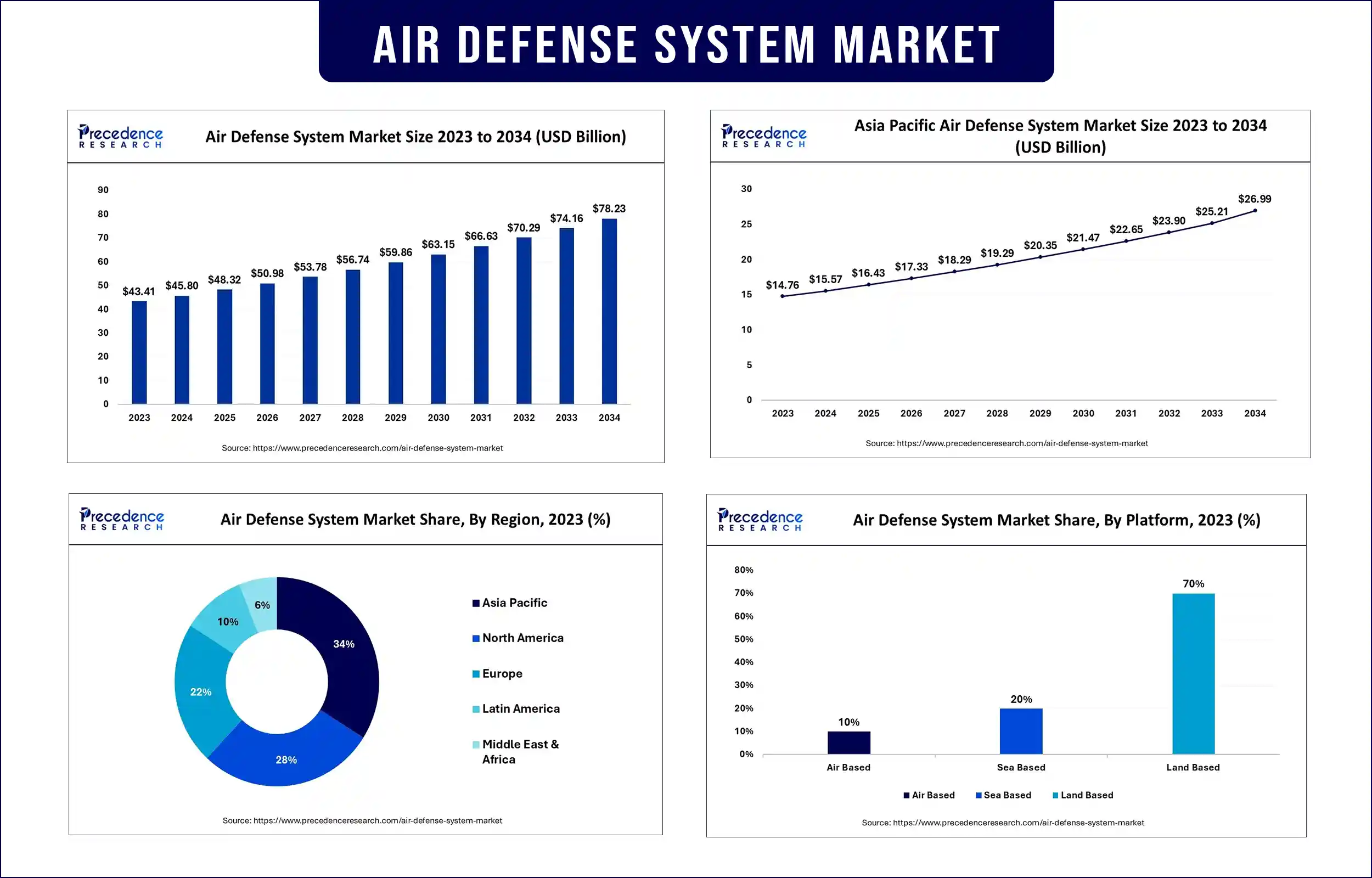 Asia Pacific dominated the global air defense system market in 2023. The region's dominance is attributed to the rising defense expenditures of countries like China, India, South Korea, and Japan. Governments are investing heavily to deploy air defense systems that play a crucial role during war. In addition, rising geopolitical tensions, such as the India-China border conflict and China sea disputes, are contributing to regional market growth.