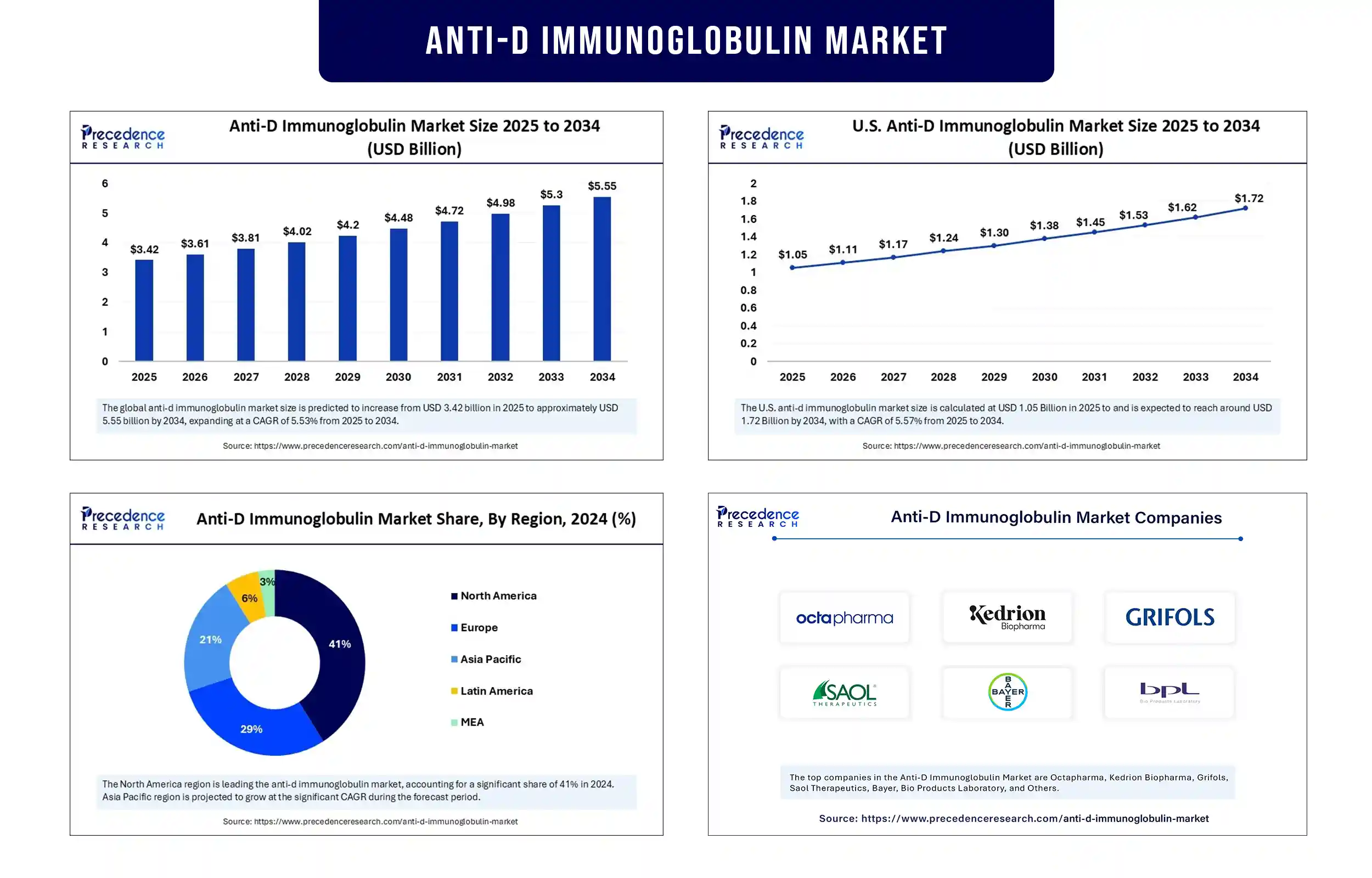 The global anti-D immunoglobulin market revenue surpassed USD 3.42 billion in 2025 and is predicted to attain around USD 5.3 billion by 2033, growing at a CAGR of 5.53%. The growth of the market is attributed to the increased awareness of Rh incompatibility, increasing birth rates, and rising demand for combination therapies.