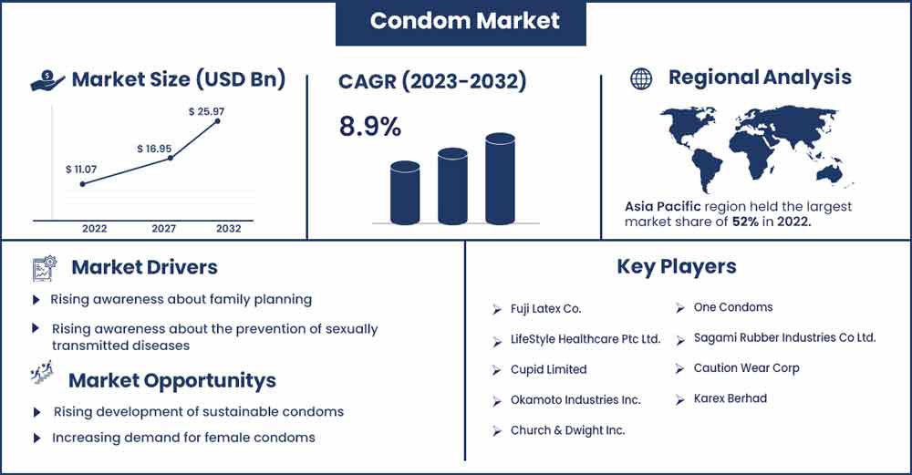 The global condom market size is anticipated to reach around USD 25.97 billion by 2032 up from USD 11.07 billion in 2022 with a CAGR of 8.9% between 2023 and 2032.