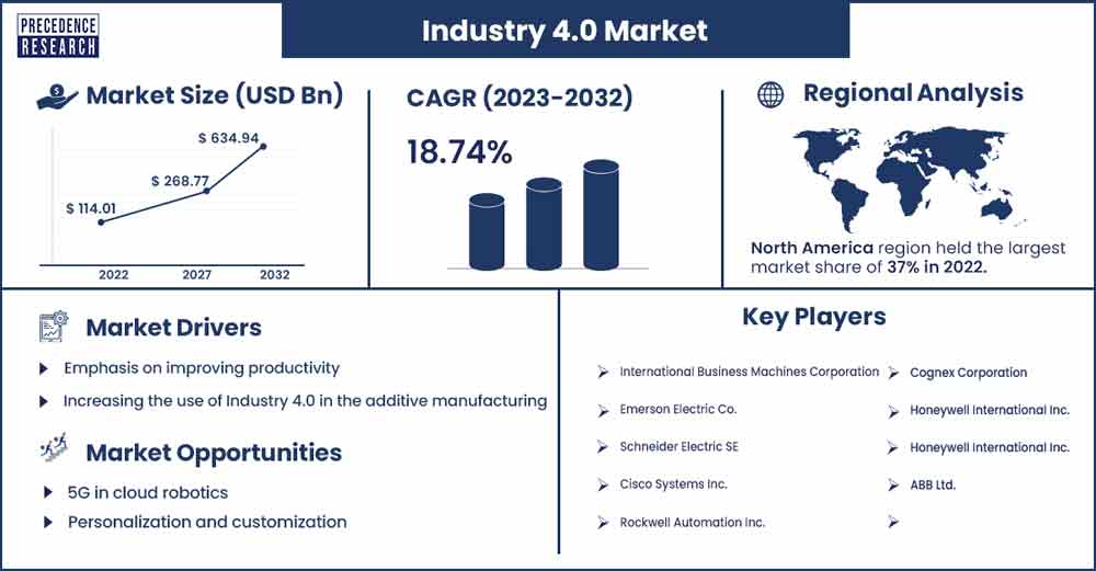 The global industry 4.0 market size was exhibited at USD 114.01 billion in 2022 and is anticipated to reach around USD 634.94 billion by 2032, growing at a CAGR of 18.74% from 2023 to 2032.