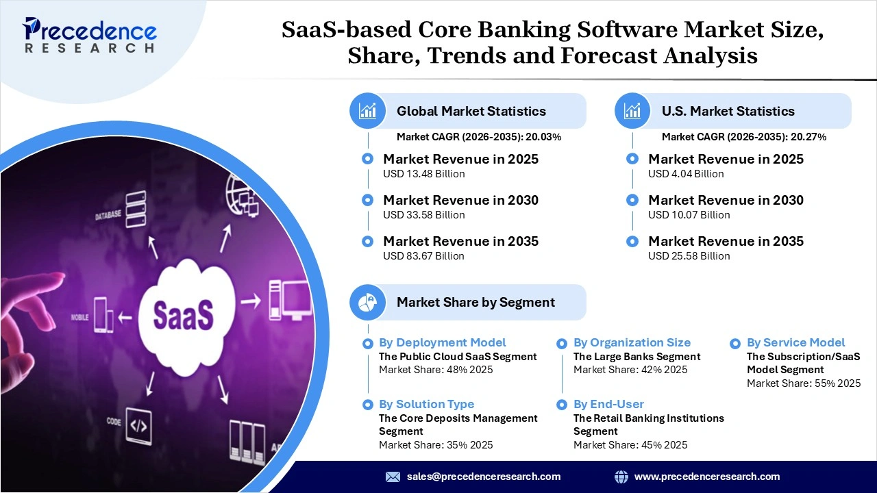 The global SaaS-based core banking software market revenue surpassed USD 13.48 billion in 2025 and is predicted to attain around USD 83.67 billion by 2035, growing at a CAGR of 20.03%. The market is experiencing a significant growth rate due to the growing shift towards predictable subscription-based operational expenses while modernizing their legacy systems.