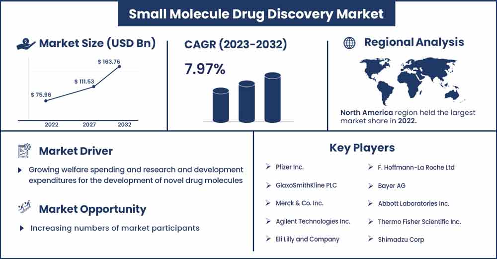The global small molecule drug discovery market size was evaluated at USD 75.96 billion in 2022 and is expected to attain around USD 163.76 billion by 2032, growing at a CAGR of 7.97% from 2023 to 2032.