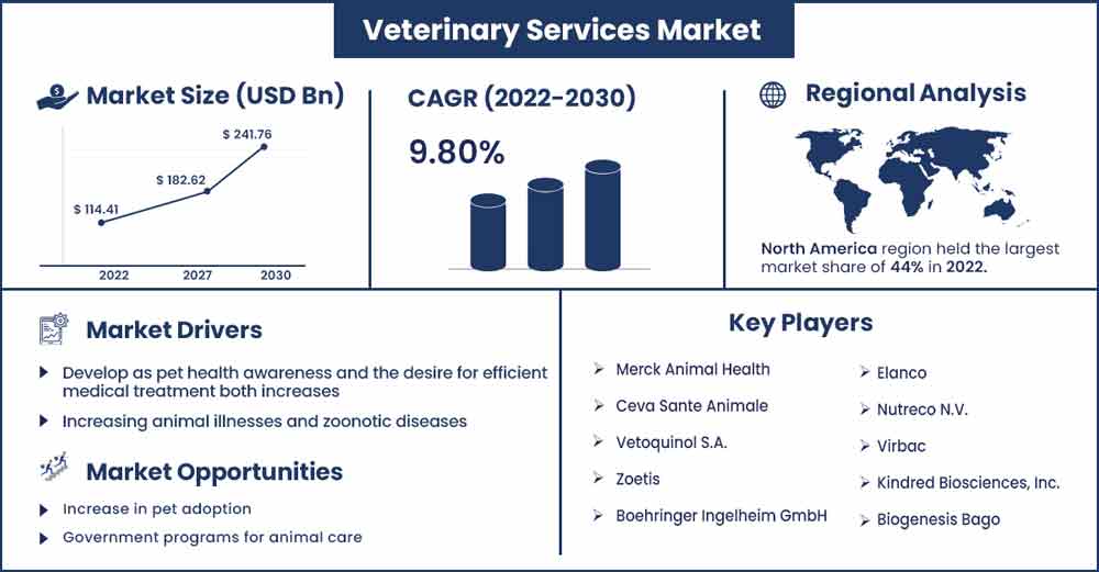 The global veterinary services market size surpassed USD 114.41 billion in 2022 and is projected to rise to USD 241.76 billion by 2030, anticipated to grow at a strong CAGR of 9.8 percent during the projection period from 2022 to 2030.