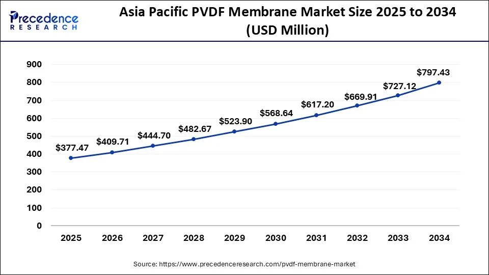 The Asia Pacific PVDF membrane market size was exhibited at USD 347.77million in 2024 and is projected to be worth around USD 797.43 million by 2034, poised to grow at a CAGR of 8.65% from 2025 to 2034.