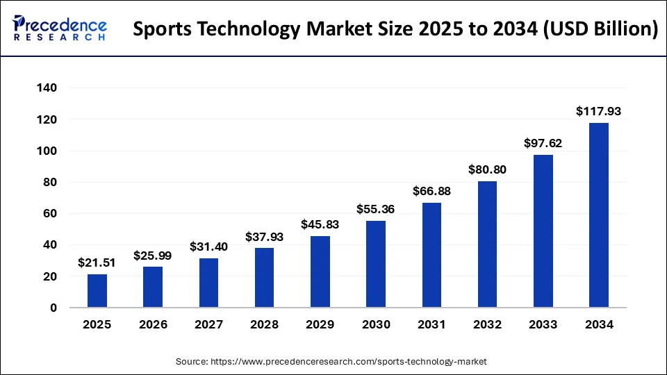 The global sports technology market size is valued at USD 21.51 billion in 2025 and is anticipated to reach around USD 117.93 billion by 2034, growing at a solid CAGR of 20.81% over the forecast period 2025 to 2034. The rise in audience engagement in sports and increasing competition among athletes are the driving factors of the sports technology market.
