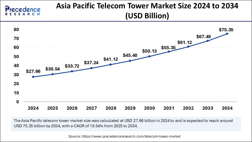 The Asia Pacific telecom tower market size was exhibited at USD 27.66 billion in 2024 and is projected to be worth around USD 75.35 billion by 2034, growing at a CAGR of 10.54% from 2025 to 2034.