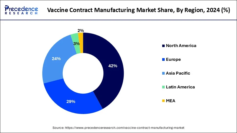 North America has held the largest revenue share 42% in 2024. North America commands a substantial share in the vaccine contract manufacturing market due to several factors. It benefits from a mature pharmaceutical and biotechnology industry, with a high demand for vaccines driven by a large population and a strong focus on healthcare. Additionally, the region boasts advanced manufacturing infrastructure, well-established regulatory frameworks, and a skilled workforce, making it an attractive hub for contract manufacturing organizations (CMOs).